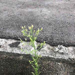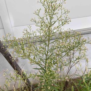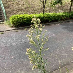 見えにくいけど、ヒメムカシヨモギと思われます。さがみ湖レジャーフォレスト内で出会いました。 食用にはあまり適さないそうですが、原爆投下後の長崎か広島では食料がなく致し方なく、これを取って食べていたというエピソードを読みました。