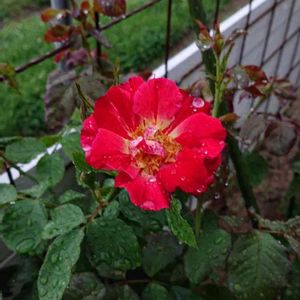 🌹雨の中フォース・オブ・ジュライの 花が咲いてました、本来はピンクと白の絞りが入るんですけど、今は赤が強く出ています。