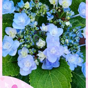 ❀紫陽花 舞孔雀❀ 額紫陽花で装飾花も、中央の両性花も八重咲きで、ボリュームが有ります❀❀ 花色が、毎日変わって行くので、見ていて楽しいブルーの紫陽花です💙 手前が咲き始めで、満開になると綺麗なブルーになります✨💙✨