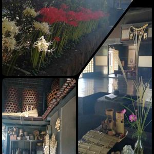おはようございます。 昨日アップした 三芳町のお芋カフェ近くの 旧島田邸です。 藁葺屋根の古民家で 寺子屋もやっていたようです。 藁葺屋根のために 囲炉裏の火をたやさず 彼岸花上の霧のようなものは 煙です😁 家の中のお道具は燻されて 飴色になってました。