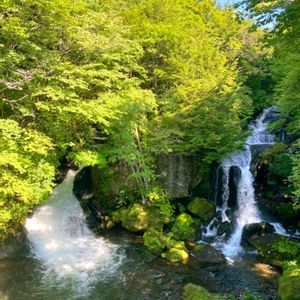 奥日光の美しい自然シリーズ🎶 これは竜頭ノ滝💦です(*´꒳`*)💕 綺麗でした✨ 滝つぼ近くが大きな岩で二分され、その様子が龍の🐲頭に似ていることから、この名がついたと言われています。 (左右の滝の流れが龍のヒゲ🐉)