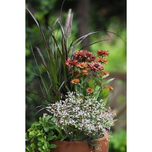 ◆寄せ植え ...と言うことで、 ■パープルファウンテングラス ■ルドベキア・ルビールビー ■ユーフォルビア・ブレスレスブラッシュ ■フロックス・シアウッドパープル を箱庭にお迎えすることにしましたが、まずは言い訳から... 市内に住んでいる孫が来ると言うのでお迎えに湘南台へ... 湘南台に行けばいつもお世話になっている、園芸店のルーシーグレイに寄ってきました。 レンズを買うお金を貯めている身としては、余り近寄ってはいけないのですが、久しぶりにパープルファウンテングラスを見つけてしまい、気が付いてみると籠の中に入っていました。 そしてルドベキア・ルビールビー...この花の色を見て、久しぶりに寄せ植えでも作ってみようかと思った次第なんですが、久しぶりに来た孫を放っておく訳にもいかず、寄せ植えの植え込みは出来ず、取り敢えずイメージだけでもと言うことで、鉢にポット苗を放り込んでみましたが、何とも地味~な寄せ植えになってしまいそうです!!