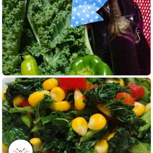 『ケール』 お昼に残った 🌽トウモロコシと赤パプリカで炒めました‼️