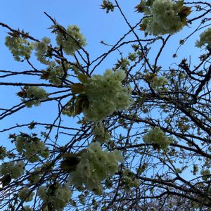 買い物途中の道すがら 街路樹のハナミズキが小さなお花を咲かせました 通り抜けの公園に植えられている御衣黄桜 ようやく咲き始めました 桜はこれで終わりかな😥 街路樹のイチョウ 投稿されていたイチョウの木に お花が咲くことを今更ながらに知ったので この木は雄花か雌花か咲いてるかなっと📱パシャ ちっちゃなタマタマ2つあるのが見えるから雌花かな😁 公園のドウダンツツジ 可愛いおはなを見つけて 今日も🚲止めて📱パシャ 川沿いの遊歩道にかりんのピンク色のお花🩷 後ろの方に桜🌸とコラボで