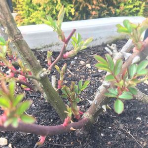ローズうらら🌹お花は去年のpicです◡̈❁ 左上が去年、左下が今年の新芽🌱 葉っぱの色が違いすぎ⁈