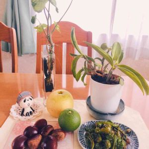 わたし スーパーのお花売り場のさようならコーナーから4年前かやってきましたコスモアロハ。本当は自分の横にもうひとつお花が咲くはずだったの😟。その妹は蕾をナメクジに穴を開けられちゃったの😢。梅雨の間はナメクジにやられないように白い排水溝ネットの服を被ってたけど、夏休みの間はナメクジ来ないから服を脱いでたの。二人揃ってデビュー咲きを楽しみにしてたのに残念😥。香りも凄くよくて、丈夫で毎年咲くの。上級者は年に2回も咲かせられるみたいだけど。またバルブ大きくして頑張って💪GSデビューしますね。