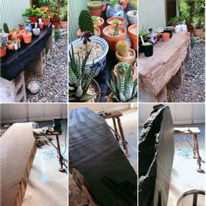 小屋の庭から ① サボテン🌵や多肉植物などを置く台、やっと塗り終わって外に置くことができましたー ② のびのびと育ってくれー。 粗探しはやめてね😅 ③ 小屋の中にあった板をただ置いただけ(笑) ④ オービタルサンダで研磨。 これが職人だったならつるっつる✨になるまでやるんだろうけど💦 ⑤ キシラデコールジェットブラックで塗り塗り🖌 ⑥ 全部塗り終わってみると、大きな炭みたいだな😆