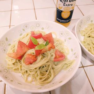 ビール片手に作ったメインディッシュ、自家製のバジル&トマトの冷製ジェノベーゼ🍝 バジルは氷とアボガドも一緒にフードプロセッサーでフローズンソースにしたので、暑さをぶっ飛ばす一品になりました🌿 …ガーデニングと料理が休日の趣味のボクです(*^^*;)