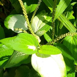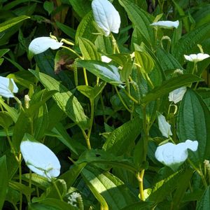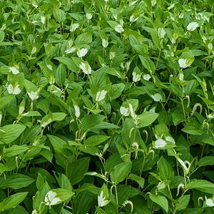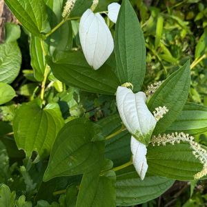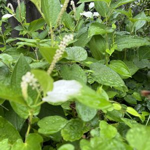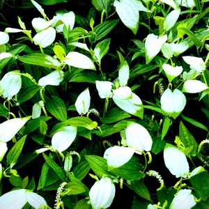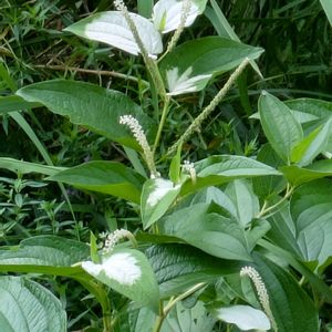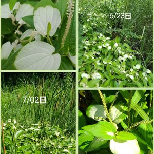 夏に小さな花が穂状に集まる 花には花弁もガクも無い 花の周囲の葉🌿が白く変色 するが 梅雨明けの頃には 緑色に戻ります🤍→💚 半夏生(はんげしょう) 別名 片白草(かたしろぐさ) ドクダミ科