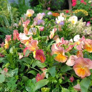 レディオブシャーロットが見頃を迎えています✨ 過去一の咲きっぷりです🤎 スーパーベナのピーチメルバもやっと咲いてきた♥️🩷 垂れるように咲いてほしいな。