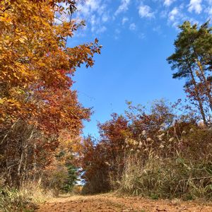 秋晴れの青い空に 黄色の葉っぱと赤い実が映える✨ 天女山にて