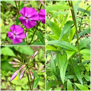 この花は何でしょう? →フロックスと教えていただきました❣️ 毎年生えてきて、今頃咲きます😀 左上:花は2cmくらい 左下:つぼみ 右:葉は細長く対生。茎、葉とも無毛 草丈:30〜60cm