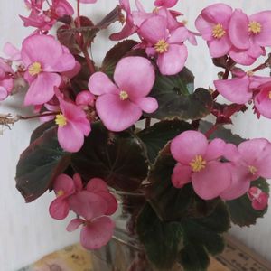 ベゴニア💗センパフローレンス 夏からずっと咲いているベゴニア、霜でやられる前に切って空き瓶に挿しました 水揚げもよく、長もちしています😊 本体のほうはとりあえずミニ温室に入れたけど枯れる気がする(実家のベゴニアは戸外で毎年越冬しています、強健!)