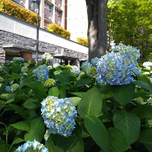 🍃💠紫陽花 毎年恒例の投稿になっている「御池通」の紫陽花です。 道路の反対側には少し遅れてアナベルが咲きます。(次の投稿) 建物は御池中学校🏫です。この時期に京都へ来られる際は、是非探してみてくださいね*¨*•.¸¸♪