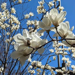 今日のお花の🤍モクレン🤍 1か月前の3月15日撮影の、御池通りに咲いていた真っ白のモクレンのお花が、青空に映えて美しかったです😍💖