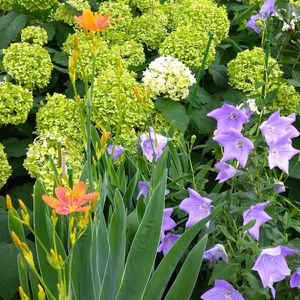 純白から、もう一度ライムグリーンへと変化してきた🌼アナベル🌼と💜キキョウ💜そして、咲き始めてきた🧡ヒオウギ🧡の競演です😍💖
