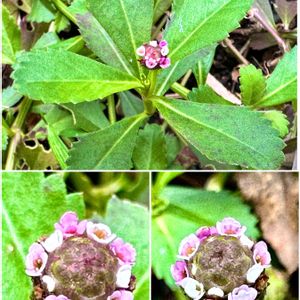 小さい可愛い花をつける薬草になるクマツヅラの仲間で「イワダレソウ」と言います😍 基本的には花柄が立ち上がるだけで地面を這い、グランドカバーに使われます。芝生の10倍と言われるくらいの繁殖力で安易に植えるとえらいことになりますね😅 これとか、ヒメがつくもの、園芸用に改良されたものもあって、広い飛行場の緑化などにも使われています。 見た感じウツボグサみたいな感じもしますが茶色の部分は苞葉が煉瓦みたいに重なり合って、その周囲に小さい花をつけます。 これは花が小さいですが、盛期にはもう少し大きな花が開きます😄