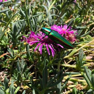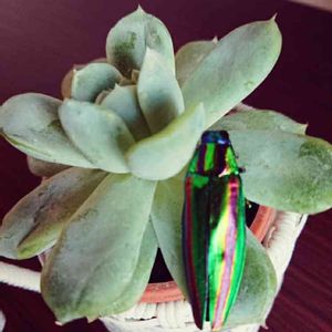 玉虫発見🎶💕 今までも、羽だけは見たことありましたが、 今回は、 生きてはいないけど、 無傷のは初めて‼️ キラキラ〜💕 とっても綺麗で神秘的。 国宝の玉虫厨子を、正倉院展で拝見したことがありましたが、 これらを作りたくなる気持ちがわかりますね💦😅 多肉植物寄植え🪴と。