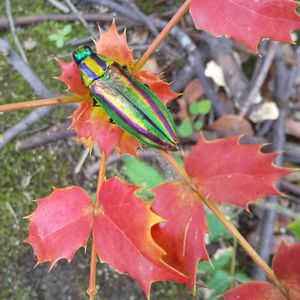 今日は万博公園の日本庭園にある蓮池を見に来ました。紅葉した「ヒイラギナンテン」に玉虫がいます。🍁💚🧐😊😄🤗✌️