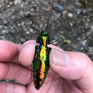 🦗タマムシ🦗←ヤマトタマムシ (タマムシ科) 花でなくてごめんなさい🙏 タマムシって言ったらこの子しか知らなかったけれど…たくさんいるんだね〰️😄 この子がいっとう 綺麗💚💕 この翅が装飾に使われるのテレビで見たことある📺 歩いてたら🚶♀️たまたま前からタマムシが飛んできた。 黄金虫かと思ったけれど振り替えったら玉虫色💚 思わず持ってた日傘でタマムシの行く手を阻んで下に落としてしまった💦ごめんよ🙏 出会ったらどうしても挨拶したくて🙏 ここに丁度エノキ🌳があるから🌿出会えるんだ。今年も無事に。 とても元気で家には連れて帰れなかった💦 慌てて写真撮らせて貰って 泣く泣く帰りました🤣←違うやろ〰️😅自然の中が一番だよね❤️ モデル料払えないけれど ありがとう~💕 花友さんのリクエスト🙏🎶 投稿するつもりなかったけれど出番があって良かった🎵 ありがとう~💕 7/18