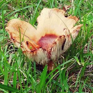 *キノコ(茸) 🎵この茸、何の茸❔気になる茸、見たことの無い茸ですから~🎶見たことのない~花が咲くでしょう❔🎶(ウフフ…花は咲かないか🤣) キノコの名は不明、存在感あり、ひとつだけ生えてました🍄 花言葉…疑い