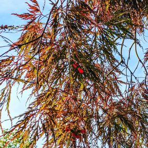 久しぶりの青空💕 これ、なんて名前か、去年調べたような❓ これは、元々も赤いですが、この時期、真っ赤になります。 同じような細い葉のモミジは、緑色から紅葉していきます🍁😁🧐 ベニシダレ、のようです❣️ 緑色のは、手向山(タムケヤマ)ですねー😁🍁 タムケヤマも、徐々に紅葉してます🍁