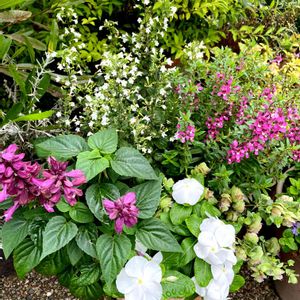 今日の花、日々草の寄せ植え🤍💗 白い日々草とラズベリー色の二種の花が、暑さにめげずに頑張っています。 後ろのカラミンサは爽やかな香りを届けてくれます💕