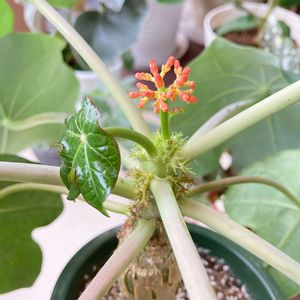 我が家のサンゴアブラギリだいぶ大きくなりました🥰 3人娘だったけど次女をお友達にお嫁に出して鉢の中が広くなったせいか急に大きくなりました💦 はじめのうちはかわいいまあるい葉っぱだったのが朝顔の葉みたいに3つにわかれ、今度はモミジみたいに5つに分かれてきてます 葉っぱの形がこんなに変わるなんて不思議😆✨ そして今朝‼️ 成長点になんかある‼️ オレンジのつぶつぶ🧡 もしや花芽かな😆💕💕 楽しみです♫