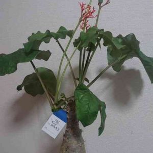 久しぶりの新入りさん サンゴアブラギリ 〔Jatropha・podagrica〕 サンゴアブラギリは主に中央アメリカが原産の落葉低木🌳 幹がトックリ状にふくらんだユニークな形になります✨ 濃い朱色の小花をかためて咲かせますが、花だけでなくその下の軸の部分も花と同色💐になってその様子が珊瑚に似ていること🌱 更に、5つに分かれた手のひら状の葉っぱを桐の葉に見立てて「珊瑚油桐」の名前が付けられたとみられます🎵