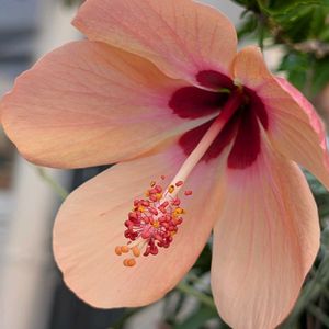 今日咲いてた【ハイビスカス🌺】 アプリコットな色とカップ咲きの様なところが可愛らしいでしょう❓️ 去年処分品でお迎えしたのだけど、大正解でした🥰💞🥰💞🥰💞