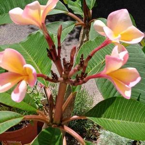 プルメリア 咲きました。 去年より一月早い開花です。 まだ、1輪だけですが満開や他のプルメリアの開花が待ち遠しいです。
