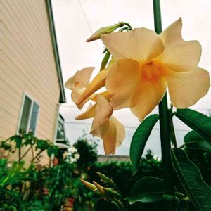 うちにも、ありました。 「マンデビラ・アプリコット」 黄色、赤、ピンク、ピンク・ジャイアントと咲き出し、咲き揃ったと思ってたらアプリコットも咲きました💕 あと、1本咲いてない鉢はどんな色だろう❓🤔