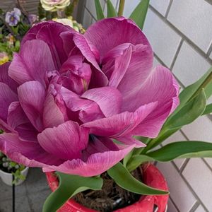 玄関のチューリップ🌷 今年はこの子をお迎え 冬越組はまだまだ葉っぱだけ😓 チューリップってどうしても翌年上手く咲かせられないのよね〜😭