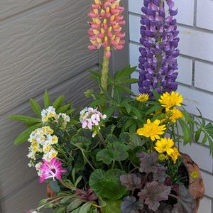 今日寄植え作りました。 ルピナス ゼラニューム ネ゙メシア リビングストーンデージー など、春のお花を盛込みました🤗 出来はともかく玄関が華やかになったわ〜🥰