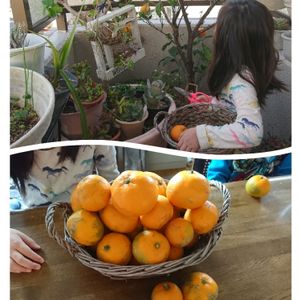 おはようございます。もうお昼でした。‼️ 今日は孫ちゃんが来てミカン狩りミカン狩りと大騒ぎでした。足場の悪いのも何のそのハサミとかごを持ち上手にカットしてました。 手の届かないところは手伝って下のように収穫ができました。 さてクイズです。 ミカンは何個収穫出来たでしょう⁉️