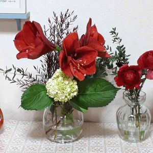 花瓶の水換えついでに、水揚げ良く。。と少し短く✂️してみたら、どうしても1つの花瓶に元通り入れられなくなりました😅💧 バランスが難しいなぁ😣💦💦 諦めて花瓶2個体制で😄💦💦