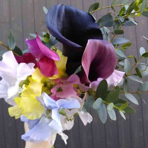 生花ってキラキラしてるなー😍 スイトピー カラー パルブラユーカリ トータル350円位の花束です 生花の元気もらって、年末の忙しさをのりきるぞー💪