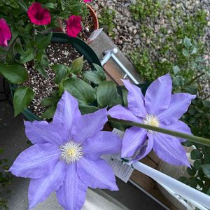 こんにちは😃💜 今日の私のお花は大好きなお花クレマチスさんです🥰👍👍 このクレマチスHFヤングは花咲き始めから少し時間が経つと花色が変わります。 (((o(*゚▽゚*)o)))💜💜💜🍀🍀 ◎ クレマチス 鉢植えで育てる場合、又苗が定着するまでの時期、苗に対して鉢が小さくなってきた場合など植え替えが必要な時があります。 基本的に真夏などの高温時以外でしたらどの時期に植え替えても大丈夫ですが、開花真っ最中などはもちろんですが、せっかく誘引したツルが伸びている時や旧枝咲きタイプだと去年のツルを残さないといけないので、苗が休眠している12~2月に植え替えするのが最適です。 鉢植えの場合は表面の土が乾いてきたら鉢底から出てくるくらいにたっぷりと与えます。春から夏にかけては毎日、真夏は1日2回与える事もあります。この時も真昼の暑い時間ではなく朝の涼しい時間に与えます。 秋になってもまだ開花する種類がありますので毎日欠かさず与えましょう。冬の休眠中になって2日に1回でも大丈夫です。 地植えの場合もほぼ同じですが、梅雨時期は少し回数を減らし冬も2~3日に1回でもいいです。 ◉ 四季咲きなので今季3回目です🥰😍💜💜💜 🏷 青い花で納涼祭2022 この綺麗な色合いのクレマチスさんは涼しさを与えてくれています。 (((o(*゚▽゚*)o)))💜💜 素敵な土曜をお過ごしください🤗💐💐