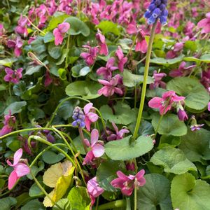 こだわり花屋さんと見元園芸さんとのコラボビオラで、ライジングアイス風さん✨ 夏越し出来たニオイスミレの小さなランナーを足元に植えておいたらポツリポツリですが咲いてくれました❀.(*´ω`*)❀.