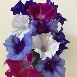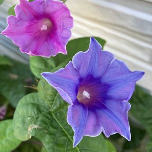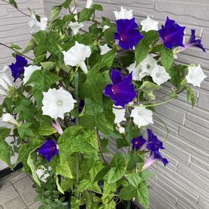 【朝顔】 つのたんの朝顔市 『桔梗咲き朝顔』 咲かないなぁ〜 やっぱり日当たり良くないとダメかなぁ〜 と思っていたら今朝2つ咲いていました❣️ 朝顔育てるのは久しぶり🤩 咲きそうな蕾を筒状の紙で包んでおいて、翌日外すと咲く瞬間が見られるとか❗️ やってみようかしら?☺️