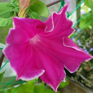 《実家の母へリクエスト》🙇♀️ 袋入りのタネ表紙の鮮やかな可愛い 朝顔…一目惚れしました🥰 実家の庭で育てて貰い開花しました‼️ 美しい桔梗咲き朝顔です💜💙