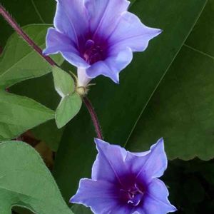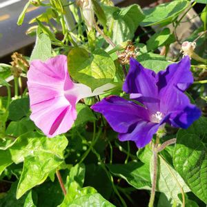 種を採る頃には花の色がわからなくなり、毎年咲くまで何色かお楽しみの朝顔。 今朝はピンクと並んで紫の桔梗咲きでした!