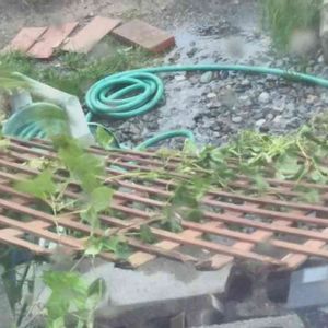 台風でラティス崩壊。 ラティスの下敷きになってる鉢は逆にラティスに守られてるのかな。 台風が去るまでなーんもできませんわこりゃ 😭