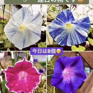 あいにくの雨の為、雫の重さで他の朝顔たちは 下を向いていますが、桔梗咲き朝顔は丈夫で 今朝も綺麗に咲いてます😃 今日は並んで咲いてます😉