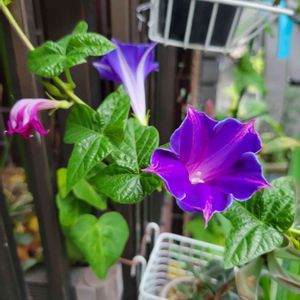 種をまきやっと咲いた桔梗咲朝顔ですが、上が今日の午前10時頃、下が午後4時頃の花の色。変わることに感動しています💜