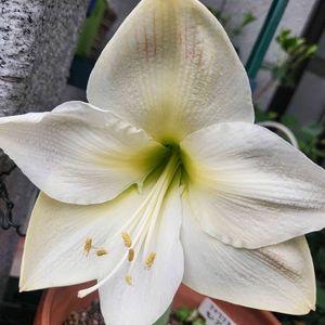 皆様も、お疲れ様です 帰宅したら、開花してました。珍しく、白!!アマリリス 小ぶりだけど、迫力あります。 葉もないのに、綺麗に開花は、嬉しいです。 御殿場錦も、開花してますが、色の変化は、進んでない気がします。しぶい赤になるのかなぁ