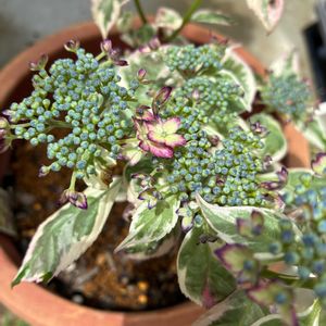 🏷2のつく日は斑入りの日 🏷斑入り見つけ隊♪ 🏷斑入り週間 参加します🤍🌿 ➀➁➂ヤマアジサイ御殿場錦4/20お迎えした開花しました💠🌿 ܸ 藍色の様なお花が素敵です💙🪴 お迎えの時の葉っぱ、縁と白と紫色だった紫色は消えました🤔 白と緑の斑入りになってます🙄