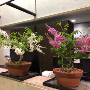 いつものスポーツジムで フロントにはいつも素敵な盆栽が かざられています。 ニワフジ 白 ピンク