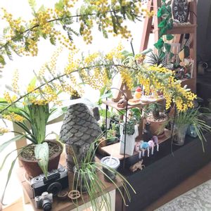 お友だちに分けてもらったミモザが可愛すぎて😍 キュンキュンしてます💛🌿✨ ミモザの下にはモルタルハウスとムスカリの水耕栽培が置いてあります。