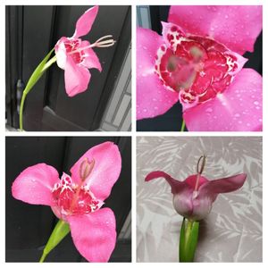 🌸教えて🌸 4月に 球根を植えたら こんなのが 咲きました🤪💕💕💕 アイリスと チューリップが 混ざったような‥‥ 軸も葉も丈も そっくりです👀 濃いピンクで とっても可愛い🤭💕 花びらが 3枚です💕 何というお花ですか❓ 🤩教えて貰ったよ🤩 中南米のアヤメ科の チグリディアですって 可愛いね🤗💕💕💕